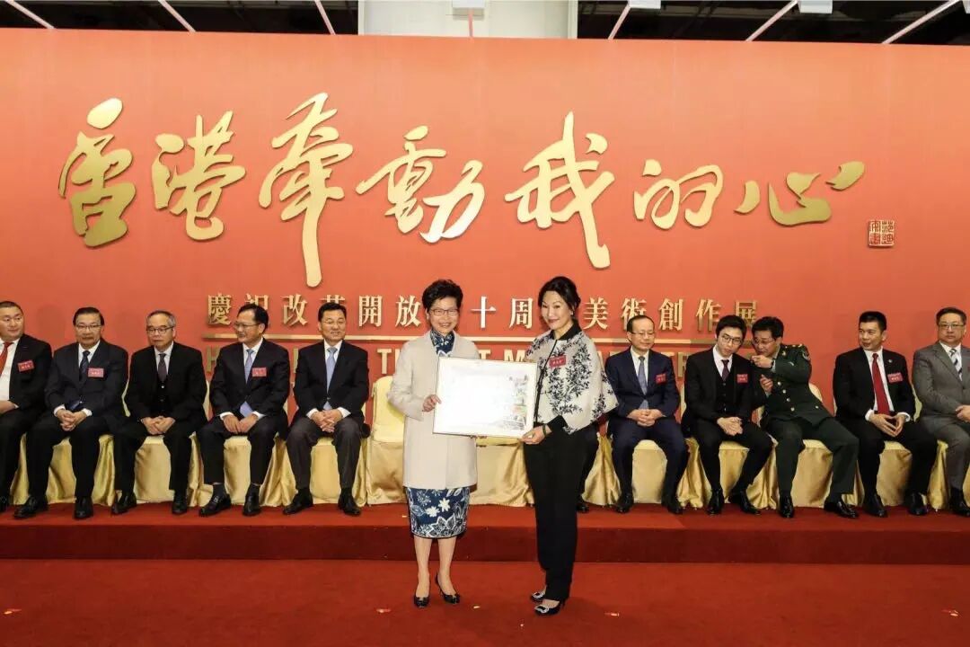 (圖為翟美卿女士從香港特區行政長官林鄭月娥女士手上接過畫作)